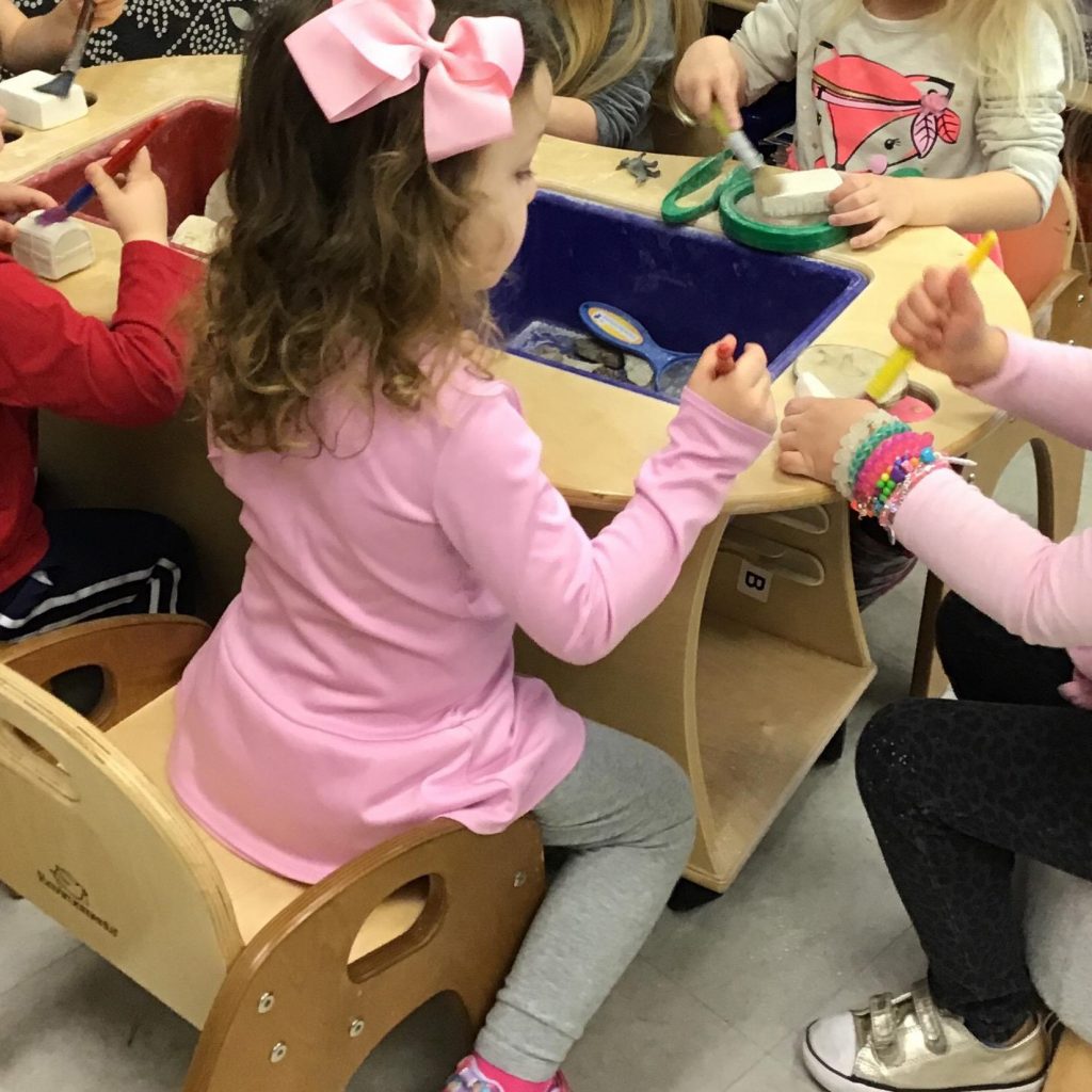 One of our favorite learning tools is the sensory table, and it was perfect for “being” a paleontologist. In the middle of the table is a recessed bin that all the children can reach. So in the bin, we placed items that a paleontologist might use in excavations: tweezers, magnifying glasses, and brushes. We also included “fossils” made of salt dough and toy dinosaurs. The students brushed the salt dough pieces gently until the fossil (a toy dinosaur, tooth, pearl, etc.) became visible. We refer to this as “sensory play.”